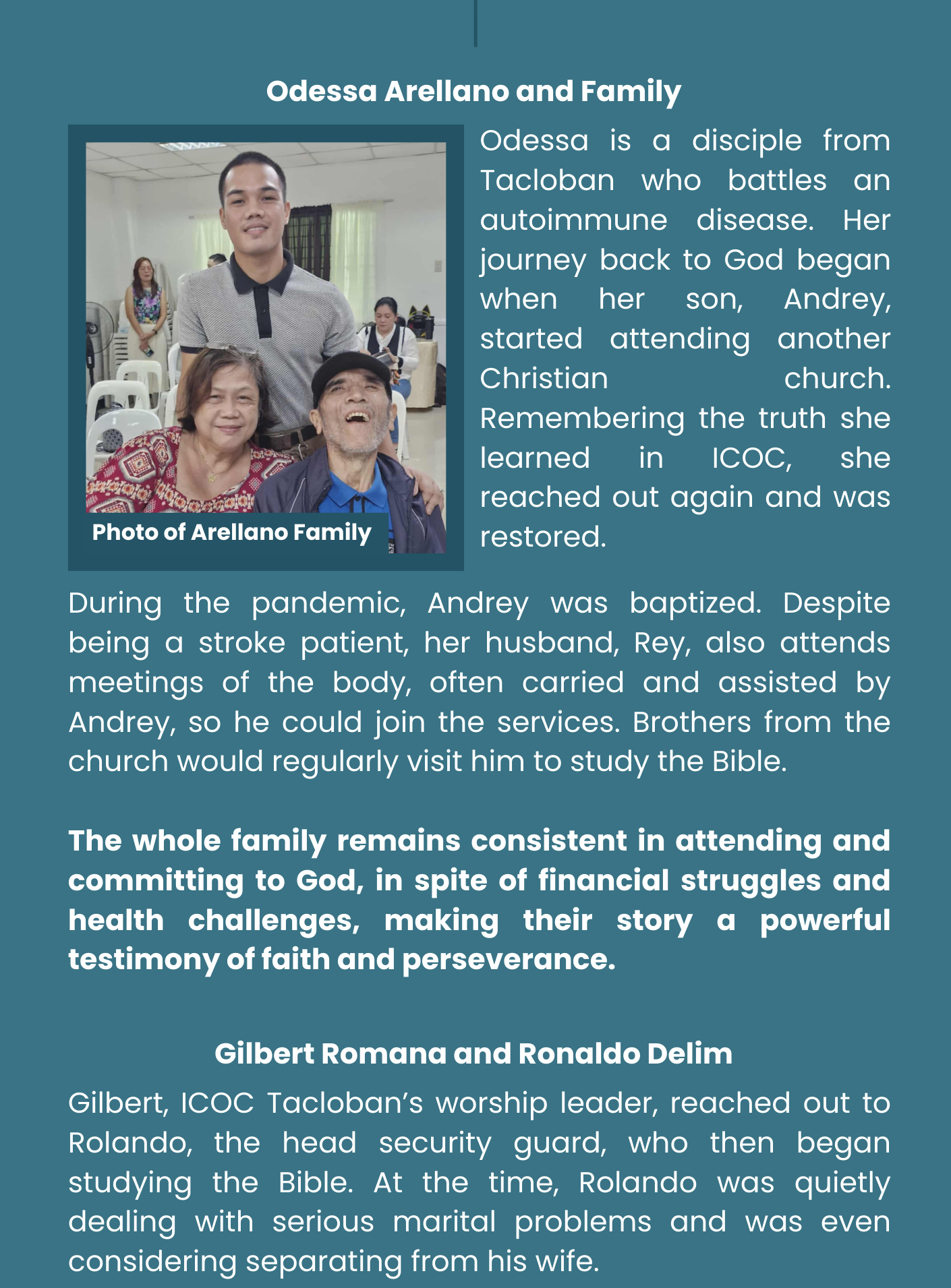 The disciples continued to gather every Sunday for worship, choosing not to give up meeting together despite the overwhelming loss around them. The entire ICOC family also rallied to support Tacloban, doing everything they could to help the city rise again. Truly, this spiritual family became God’s instrument of hope and healing during that season. In fact,